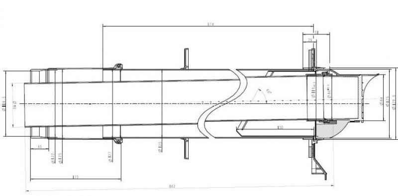 Hidegalakítási technológiával, hegesztett kötéssel készül, elektrosztatikus porfestő eljárással, felületkezelve. Az idomok tokozata szűkítve van, ezáltal az összehelyezés után egy síkot ad ki. T-600 hőmérsékleti osztályba tartozik. Jellemzők: Átmérő: 120 mm Hossz: 250 mm Anyagvastagság: 1,5 mm Szín: fekete