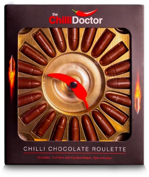 Játsszon a Chilli Csokoládé Rulettel! A szabályok egyszerűek, és a szórakozás garantált. Ez az egyedülálló ajándék 20 darab tejcsokoládét tartalmaz, de vigyázz – 5 darab extra csípős meglepetést rejt a világ legcsípősebb kereskedelmi forgalomban kapható paprikájával, a Carolina Reaperrel. Ez a játék ideális baráti összejövetelekre, családi ünnepekre vagy bátor