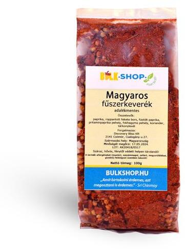 Magyaros fűszerkeverék Összetevők: paprika, roppantott fekete bors, füstölt paprika, pritaminpaprika, fokhagyma pehely, koriander, tárkonylevél. A termék allergéneket (mustárt, szezámmagot, zellert, mogyoróféléket, glutént) feldolgozó üzemben készült. Átlagos tápérték 100g magyaros fűszerkeverékben: Energia: 142kcal Zsír: 3,6g - amelyből telített zsírsavak: 0,7g Szén
