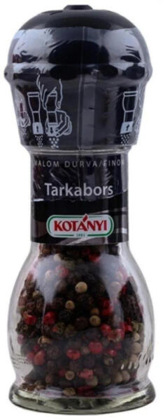 35 g-os tarkabors malom; Kotányi termék az egészséges élelmiszerek kedvelőinek. Átlagos tápérték 100 g-ban: Energia: 1368 kJ/327 Kcal, zsír: 3,1 g -ebből telített zsírsavak: 0,7 g, szénhidrát: 58 g -ebből cukor: 51 g, fehérje: 10 g, só: 80 g. A Kotányi tarkabors az a keverék, amivel az aromás, pikáns, borsos íz a legharmonikusabban elérhető. A négyféle bors íze külön