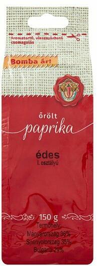 Őrölt paprika. I. osztályú édes. Átlagos tápérték 100 g termékben:Energia: 1208 kJ (291 Kcal)Zsír: 6,7 g ebből telített 1,1 gSzénhidrát: 24 g ebből cukrok: 20 gFehérje: 15 gSó: 0,1 gTárolási információ: száraz, fénytől védett, hűvös helyen tárolandó!Származási hely: Magyarország