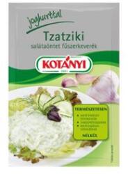 Tzatziki Salátaöntet fűszerkeverék KOTÁNYI. Kiszerelés: 13gr. / darab. Aromazáró csomagolás. Összetevők: Dextróz, Fokhagyma, Cukor, Jódozott étkezési só (étkezési só, kálium-jodid), Vöröshagyma, Citrompor (maltodextrin, gyümölcs szárazanyag), Kukoricakeményítő, Repceolaj, Bors. Jellemzők: Joghurttal összekeverve. Mesterséges ízfokozók, tartósítószerek, mestersé