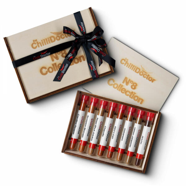 Létezik az ideális chilli fűszerkészlet! A szalaggal átkötött, fényűző fa díszdoboz tartalma a kezdőknek és a tapasztalt fűszerrajongóknak egyaránt örömet okoz. Használja kóstolótáskaként, a legjobb csilis ételekből összeállított válogatásként, vagy kóstolójátékként, amely garantáltan feldobja a bulit. Megtalálható benne az enyhébb Ancho és Green Jalapeño