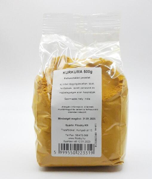 Kurkuma 500g Fitodry 100%-osan tiszta kurkuma porA kurkuma egyik fő hatóanyaga a kurkumin, egy sárga festékanyag, mely a fűszer jellegzetes színét adja. A kurkumin erős antioxidáns, hatékony gyulladáscsökkentő, daganatellenes, antibakteriális, vírusölő, antimikrobális, immunstimuláló vegyület. A kurkuma gazdag illóolajokban, amelyeknek görcsoldó és nyugtató hatásuk van a