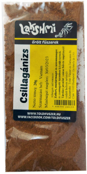 Lakshmi csillagánizs őrölt 20g A Dél-Ázsiában honos örökzöld cserjének a termése adja a fűszert. A csillag alakú termés minden csúcsában, egy-egy mag található. Íze és illata az ánizsra hasonlít. A hibátlan csillagánizs gyönyörű formája, már önmagában is pompás látványt nyújt. Gyümölcslevesek, sütemények és kompótok fűszerezéséhez kiválóan alkalmas. Ő