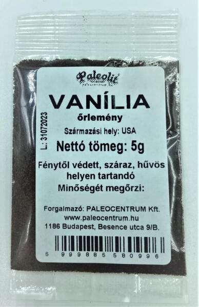 VANÍLIA ŐRLEMÉNY 5G Kiváló minőségű lágy, fűszeres ízvilágú vanília őrlemény. VANÍLIA ŐRLEMÉNY 5G Kiváló minőségű lágy, fűszeres ízvilágú vanília őrlemény. Felhasználható többek között sütemények, édességek, fagylaltok ízesítésére. Nem véletlenül volt a vanília az egyik legdrágább egzotikus fűszer: a vanillint, gyantát, vanillinsavat tartalmazó