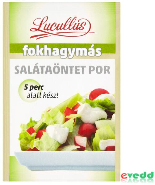 Termékleírás Jellemzők 5 perc alatt kész! Előírt terméknév Fokhagymás salátaöntet por Összetevők Fokhagyma granulátum (min. 25%), Inulin, Tengeri só, Módosított keményítő, Ecetpor (maltodextrin, ecet), Fűszer Tápértékre vonatkozó információk 100 g termékben energia 998 kJ/238 kcalzsír 0,2 gamelyből telített zsírsavak
