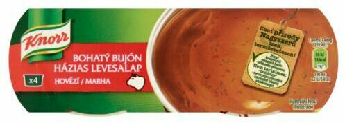 Knorr Házias levesalap marha, 112g ÖsszetevőkMarhahúsleves alaplé koncentrátum (víz, marhahúskivonat 1,7%)SóMarhafaggyú 5,4%ÉlesztőkivonatZöldségfélék (sárgarépa 1,8%, póréhagyma)CukorAromák (TEJSZÁRMAZÉKKAL)PálmazsírSűrítőa nyagok (xantángumi, szentjánoskenyérliszt)KaramellszirupPe trezselyemlevél 0,4%MaltodextrinTápanyagok 100 ml1 adag**%* 1 adag**Energia22 kJ/5