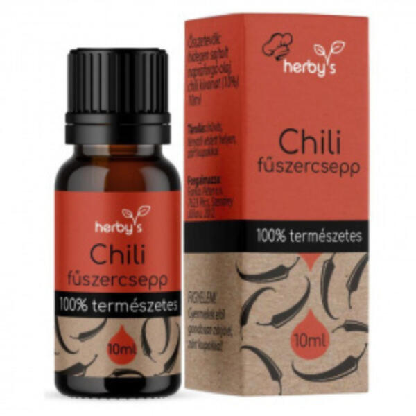 A Chili fűszercsepp esszenciáját egy különleges, 1 millió SHU erősségű. chili kivonat adja. A könnyebb konyhai felhasználás érdekében 100 000 SHU erősségre hígítjuk vissza, hidegen sajtolt napraforgó olajjal. A chili szerelmeseinek kötelező alapnyag, főzés közben és utólagos ízesítésre is kiválóan alkalmas! A herby's fűszercseppeket a legmagasabb minőségű, élelm