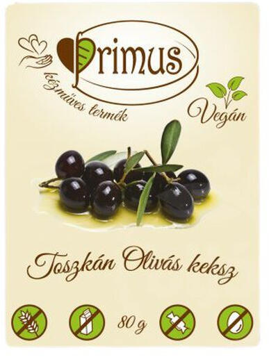 80 g-os vegán olívás keksz; Primus termék az egészséges élelmiszerek kedvelőinek.