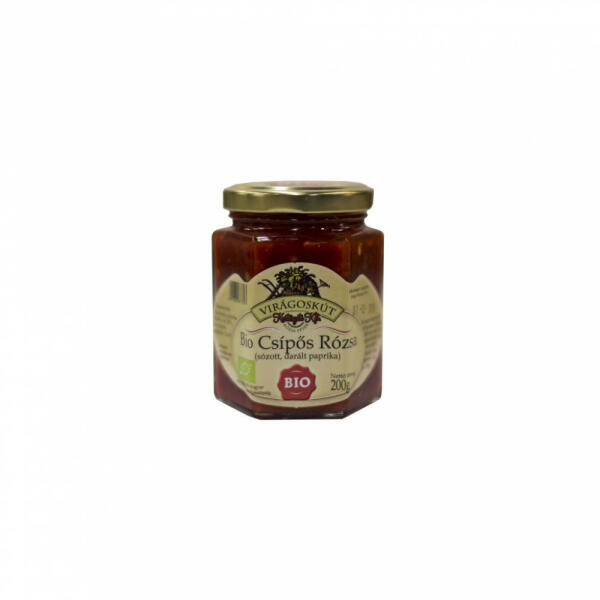 Virágoskút Bio Csípős Rózsa 200 gCsípős paparika Összetevők : bio paprika 70%; só 30% Átlagos tápérték 100g késztermékben: energia: 110kJ/26kcal; zsír: 0g; szénhidrát: 5g, melyből cukor: 0g; fehérje: 1g; só: 30g Allergén anyagot nem tartalmaz!