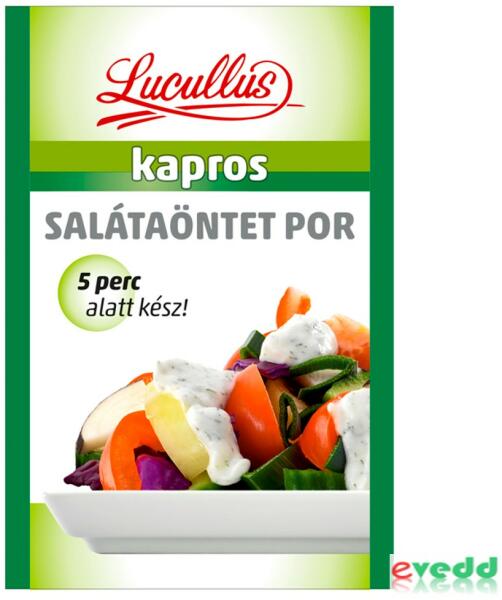Termékleírás Jellemzők 5 perc alatt kész! Előírt terméknév Kapros salátaöntet por Összetevők Inulin, Cukor, Módosított keményítő, Tengeri só, Ecetpor (maltodextrin, ecet), Szárított kaporlevél (4%), Kaporlevél kivonat Tápértékre vonatkozó információk 100 g termékben energia 1143 kJ/272 kcalzsír 0,4 gamelyből telített zsírsavak 0,2 gszénhidrát 78 gamelyből cukro