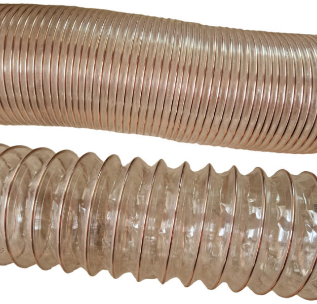 Ipari alkalmazásokhoz, elszívó berendezésekhez, CNC gépekhez ajánlott, 120 mm belső átmérőjű, 0,4 mm falvastagságú, összenyomható, rugalmas, poliuretán (PUR) elszívó cső beágyazott acélspirál erősítéssel, magas ózonálló tulajdonsággal. Ez a flexibilis tömlő kialakításának köszönhetően könnyen telepíthető és széles körben felhasználható. Összenyomhatós