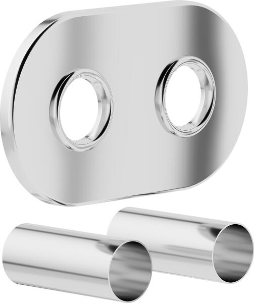 Mexen Kerek radiátorszelepfedél készlet Chrome W905-000-01 A dupla, kerek, csöves rozetta készlet a radiátor lefedésére szolgál, alsó, kombinált, dekoratív csatlakozás. Csatlakozás PEX és rézcsövek szereléséhez. A rozetta 2 furattal rendelkezik a radiátor csatlakozások átvezetésére, 50 mm-es osztásközzel. Az 50 mm hosszú maszkoló hüvelyek 16 mm - PEX és 15,18 mm - ré