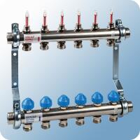 Watts szerelt osztó-gyűjtő pár áramlásmérővel, 10 körös, rozsdamentes acél, 1'-3/4' Rozsdamentes acélcsőből, EN 1264-4 szerint készült, fűtési osztó-gyűjtő. Lapostömítésű csatlakozók, mindkét oldalon 1 belső menetes csatlakoztatási lehetőség az osztóvégeken. Alacsony beépítési mélység.