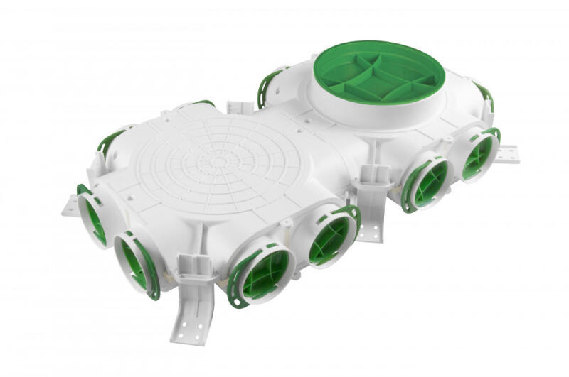 Antibakteriális, antisztatikus műanyag osztódoboznano-ezüst adalékkal, 75 mm-es rendszerekhez Műszaki jellemzők: Leágazások száma: 12 db Leágazások átmérője: 75 mm Főág átmérője: 200 mm Anyaga: Polipropilén, nano-ezüst adalékkal Antisztatikus Antibakteriális Erős, állítható rögzítőfülekkel Tőmítésekkel, végdugókkal "D" légtömörség 30 év garancia