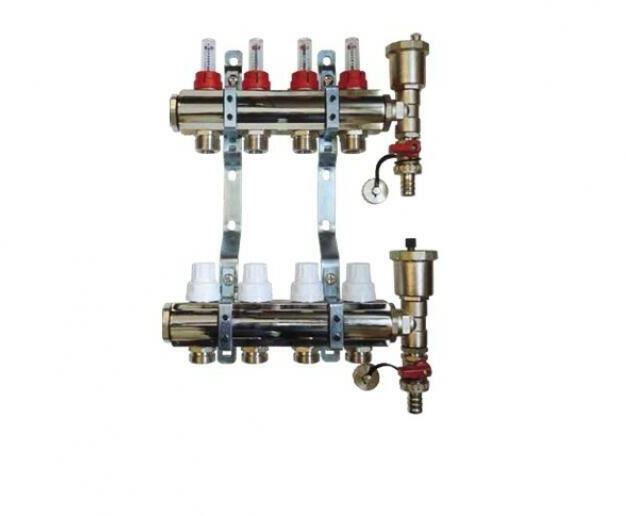 BRH 769 rozsdamentes áramlásmérős osztó-gyűjtő 1"-3/4" EURO / eurokónuszos csatlakozós, konzollal, végelemmel komplett: automata légtelenítővel + töltő-ürítővel, 5 körös, BRH-769 A kép illusztráció, azon a 4 körös osztó-gyűjtő látható!!