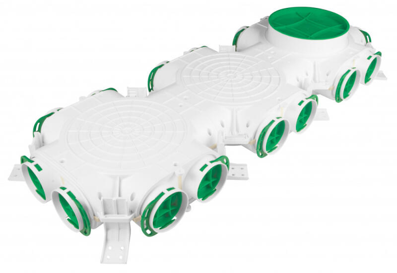 Antibakteriális, antisztatikus műanyag osztódoboznano-ezüst adalékkal, 75 mm-es rendszerekhez Műszaki jellemzők: Leágazások száma: 16 db Leágazások átmérője: 75 mm Főág átmérője: 200 mm Anyaga: Polipropilén, nano-ezüst adalékkal Antisztatikus Antibakteriális Erős, állítható rögzítőfülekkel Tőmítésekkel, végdugókkal "D" légtömörség 30 év garancia