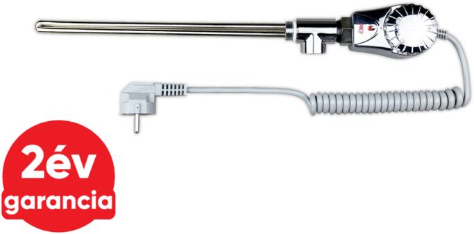 Eliko elektromos fűtőbetét beépített termosztáttal 600 W 1/2 galvanizált-króm, törölköző szárítos radiátorokhoz használható, a fűtőbetét 1/2"-os csatlakozással rendelkezik, telepítésre kész formában, tápkábellel és villás dugóval együtt szállított.