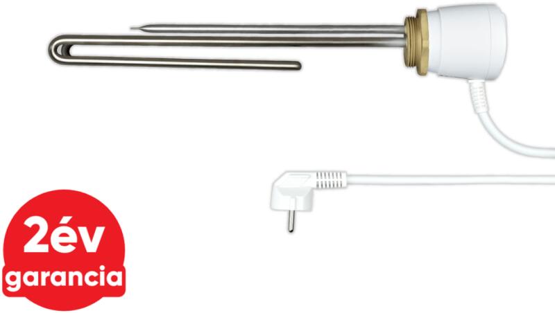 Elektromos fűtőbetét 3 kW teljesítménnyel A fűtőbetét 5/4"-os csatlakozással rendelkezik, és rozsdamentes felület védelemmel ellátott. A beépített bimetál termosztát szabályozott hőmérséklet tartománya 20-80°C, a termikus biztonsági hőkorlátozó kapcsolási hőmérséklete 95°C. A fűtőelem tartályba benyúló szakaszának hossza 350 mm. Az elektromos fűtőbetét tele