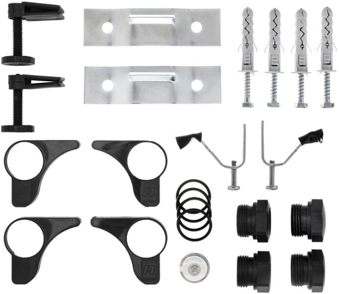 A csomag tartalma: Tartóvilla 2 db Tartó konzol+ csavarzat 2 db Beállító és távtartó csavar 2 db Műanyag véglezáró: jobbos 2 db, balos 2 db "O" gyűrű 4 db közcsavar 3 db zárócsavar 1 db légtelenítő 1 db Az egységcsomag fehér és fekete színű műanyagokkal, natúr eloxált és fekete eloxált csavarokkal kapható.