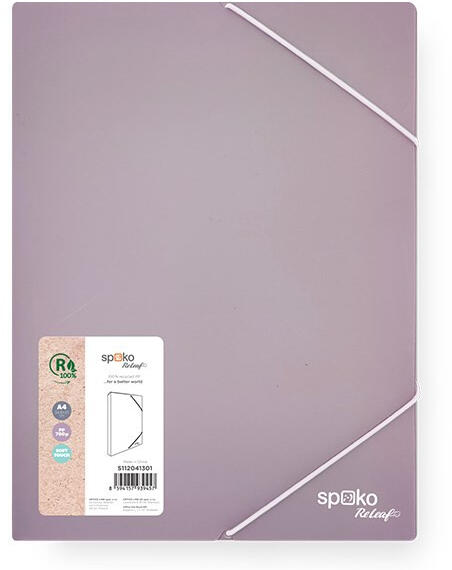 Füzetbox SPOKO ReLeaf PP A/4 30 mm SoftTouch lila Erős, könnyű füzetbox, mely nagyszámú A4-s dokumentum tárolására és hordására alkalmas. Belső fülei és a mappa színével megegyező színű, kerek, erős gumiszalag megakadályozzák az iratok kiesését. A kiváló minőségű és tartós kivitelezés megvédi a tartalmat a szennyeződéstől vagy a sérüléstől. Formátuma: A/4