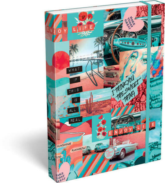 Good Vibes kaliforniai élet és környezet hangulatképeivel díszített A4-es méretű füzetbox lányoknak, hölgyeknek. Mérete: 33x4,4x24,2 cm. Szín: türkiz/narancssárga. Minőségi Lizzy Card termék. Good Vibes - Az élet napos oldala A kollekció a felsősöktől egészen a felnőttekig szól, azoknak, akik szeretnének mindennapra plusz motivációt! Las Vegas-i sivatag, kaliforniai na