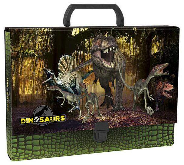 Mutatós és praktikus irattartó/rajzlap tartó táska kartonból dinoszaurusz mintával. Könnyen hordozható. Anyaga: laminált karton, műanyag fül és zár. Mérete: 33x5x25 cm - A4 formátum.