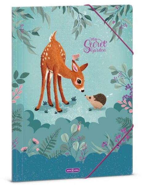 Aranyos őzikés - sünis mintájú, A4-es méretű gumis mappa lányoknak. Kemény, tartós kartonból készült. Vastag kartonból készült, színes gumipánttal. Tartós, jó minőségű. Méret: 33x24 cm. Színe: zöld, hátoldala szívecskés mintával díszített. Minőségi Ars Una termék. A bájos erdei állatos (őzike, süni) mintájú Ars Una - Secret Garden teljes kollekció itt teki