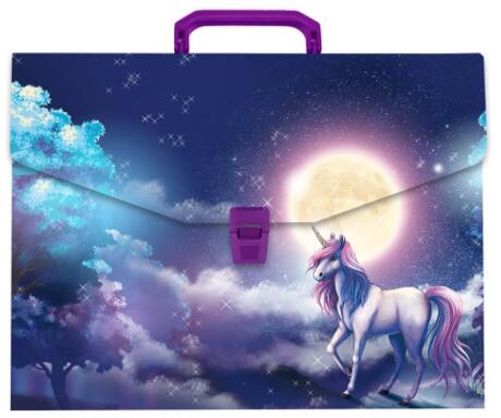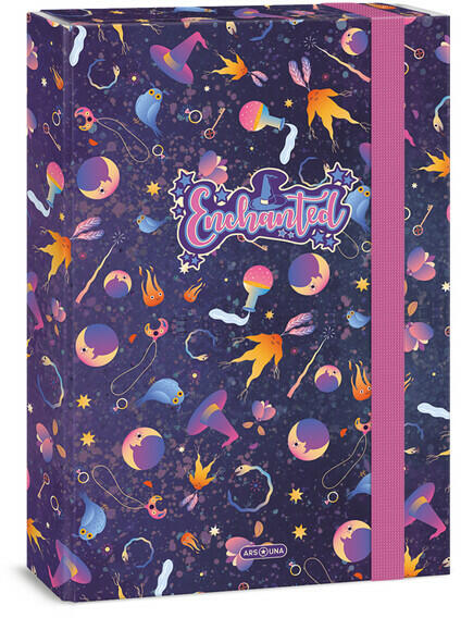 Ars Una A4 füzetbox Enchanted A/4 méretű füzetbox varázslatos, boszorkányos grafikával Kényelemes tároló munkafüzetek, rajzok, iratok számára Szuperül véd a gyűrődésektől Akár táska helyett is használható Anyaga: kemény, tartós karton 7 mm vastag, erős gumipánttal zárható Méret: 230 x 335 x 45 mm