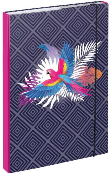 Papagáj motívummal ellátott füzettartó az A4-es méretű füzetek és könyvek tárolására. A füzettartó lapjai lamináltak és gumival vannak ellátva, amellyel a füzattartót be lehet csukni. Méretek: 32 x 22,5 x 3 cm Gyártó: Presco Group