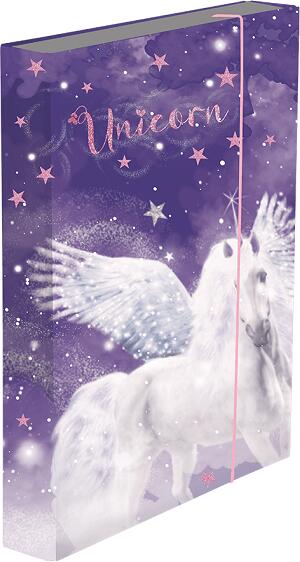 OXYBAG unikornisos füzetbox A5 A lilás füzetboxon egy pegazus látható unikornis szarvval. Mintázata alapján elsősorban lányoknak ajánlott füzettartó mappa. A kemény borítású füzetbox segítségével könnyedén tárolhatók a füzetek akár a táskában is. A füzetbox segít rendezni a tanszereket és a gyűrődéstől is megóvja. Vastag és erős gumipánttal záródik. Méret: