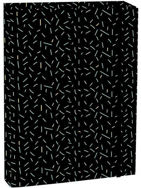 A/4 méretű füzetbox. Külseje matt fóliával és 3D dombor formalakkal. Kemény és tartós kartonból, 7 mm vastag gumipánttal. Belseje fehér színű. Füzetek, iratok tárolására vagy táska helyett is alkalmas. Méret:230x335x45 mm