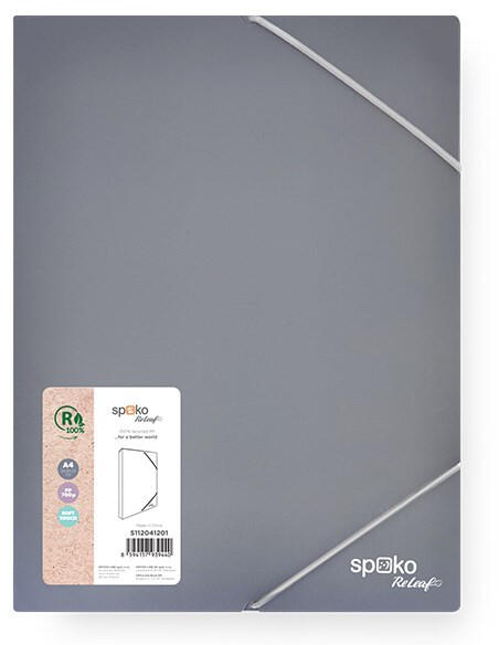 Füzetbox SPOKO ReLeaf PP A/4 30 mm SoftTouch szürke Erős, könnyű füzetbox, mely nagyszámú A4-s dokumentum tárolására és hordására alkalmas. Belső fülei és a mappa színével megegyező színű, kerek, erős gumiszalag megakadályozzák az iratok kiesését. A kiváló minőségű és tartós kivitelezés megvédi a tartalmat a szennyeződéstől vagy a sérüléstől. Formátuma: