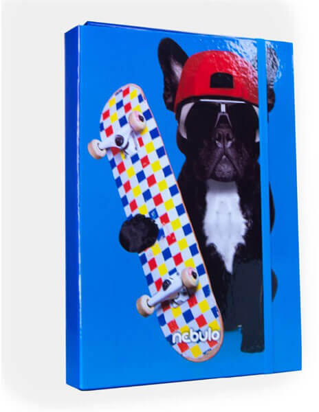 A4-es méretű füzetbox mókás gördeszkás bulldog képpel díszítve. Kiválóan alkalmas füzetek, tankönyvek tárolására. Anyaga: karton. Mérete: 33x4x23,2 cm.
