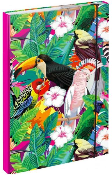 Tukánmadár motívummal ellátott lányka füzettartó az A4-es méretű füzetek és könyvek tárolására. A füzettartó lapjai lamináltak és gumival vannak ellátva, amellyel a füzattartót be lehet csukni. Méretek: 32 x 22,5 x 3 cm Gyártó: Presco Group