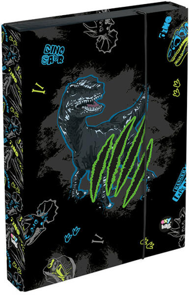 Dinoszaurusz füzetbox A/4, jumbo, OXY GO Dino, fekete. Méret: 24,5x32x4,5cm. Ideális füzetek, papírok, egyéb iratok tárolására. Gumis záródással.