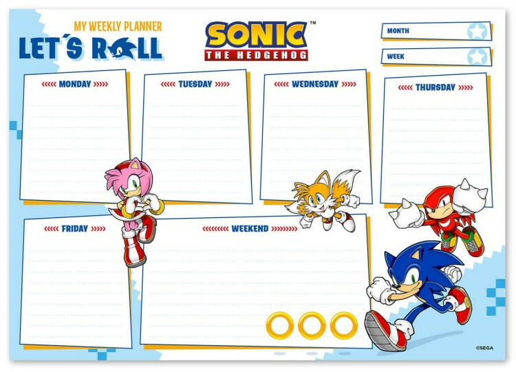 Heti tervező A4 - Sonic, a sündisznó Heti tervező A4 - Sonic és barátai szívesen segítenek megtervezni a napi programjaidat egész évben. A heti tervező 54 darab A4-es méretű, színesben nyomtatott lapot tartalmaz, amiken van hely a jegyzetek számára minden hétköznaphoz külön, illetve egyben az egész hétvégére. Az A4-es méretű tervező vízszintes tájolású, kötése raga