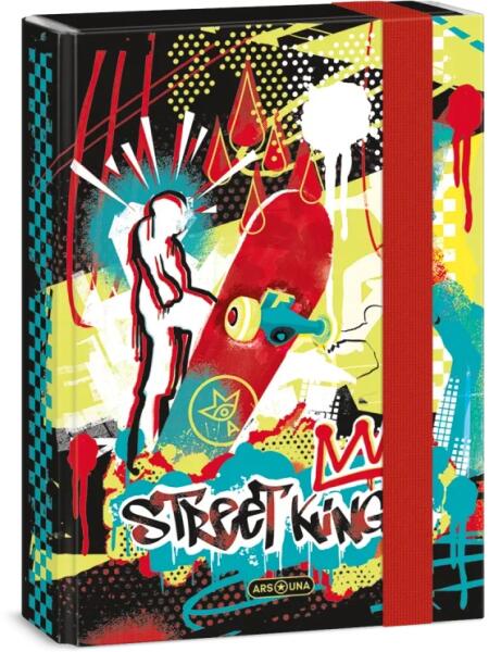 Ars Una A5 füzetbox Street Kings A/5 méretű füzetbox gördeszkás grafikával Kemény és tartós kartonból 4 cm-es gerincvastagsággal 7 mm-es gumipánttal zárható Füzetek, iratok tárolására tökéletes Méret: 160 x 220 x 35 mm