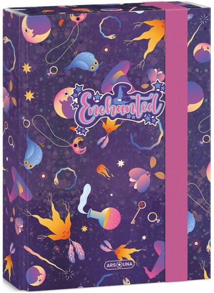 A/5 méretű füzetboxboszis grafikával alsós lányoknak. Füzetek, iratok tárolására tökéletes. Kemény és tartós kartonból, 3,5 cm-es gerincvastagsággal, 7 mm-es gumipánttal zárható. Méret: 15,5x22x3,5 cm