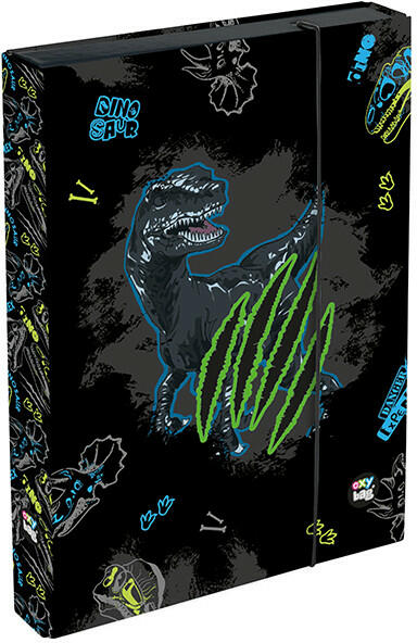 Dinoszaurusz füzetbox A/5, jumbo, OXY GO Dino, fekete. Méret: 16,8x23x4cm. Ideális füzetek, papírok, egyéb iratok tárolására. Gumis záródással.