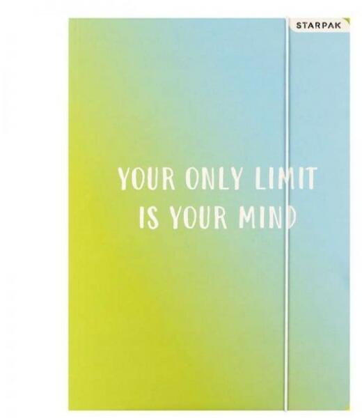 A4-es méretű gumis mappa pasztell színvilágban, Your only limit is your mind felirattal. Remek választás kamaszoknak is. Tárolhatod benne rajzaidat, jegyzeteidet. Anyaga: laminált karton. Strapabíró. Színe: zöld/kék átmenetes.