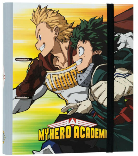 Gyűrűs mappa A4-es két gyűrűs - My Hero Academia Anime Gyűrűs mappa A4 - My Hero Academia . Ez az egyedi kialakítású gyűrűs mappa a My Hero Academia rajongói számára lett tervezve. A strapabíró gyűrűs mappa kemény borítója 2mm vastag karton anyagból készült, belseje pedig 150 gr-os matt papírral van bélelve. Rengeteg A4-es méretű lapot lehet lefűzni benne, amiket így