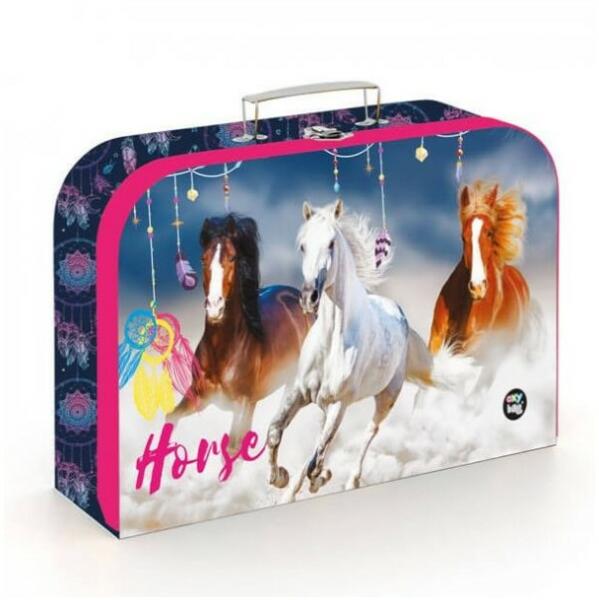 Vágtázó barna és fehér lovak mintájú karton bőrönd lányoknak, mely remek tárolóeszköz iskolai eszközöknek, vagy játékoknak. Mérete: 34x10x23 cm.
