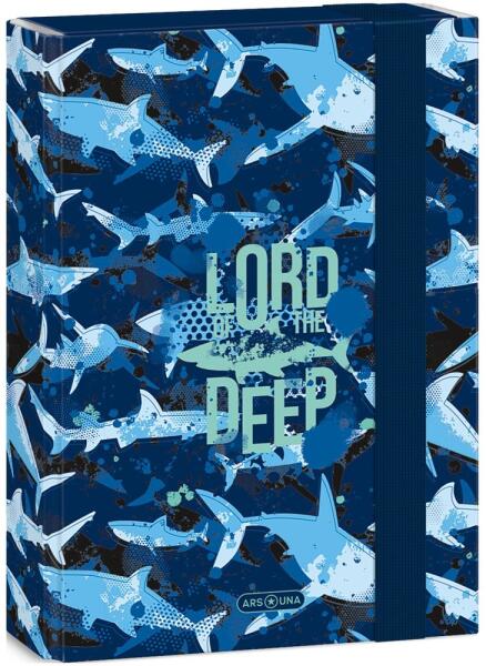 A/5 méretű füzetbox vagány, cápás grafikával alsósoknak és felsősöknek. Füzetek, iratok tárolására tökéletes. Kemény és tartós kartonból, 3,5 cm-es gerincvastagsággal, 7 mm-es gumipánttal zárható. Méret: 15,5x22x3,5 cm