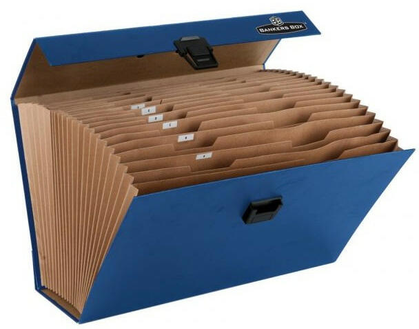 Irattartó -. harmonikatáska, karton, 250 x 362 x 124 mm. , 19 rekeszes, Fellowes® Bankers Box Handifile, kék Praktikus, aktatáska forma Erős kartonból készült, a fogantyú strapabíró műanyag Műanyag csattal zárható 19 rekesszel rendelkezik Feliratozható, a csomaghoz tartozó öntapadó indexcímkékkel 5db/csom Katalóguskód: 28855