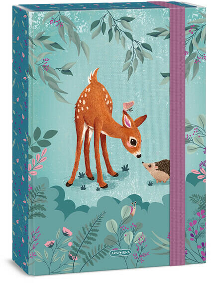 Ars Una A4 füzetbox My Secret Garden A/4 méretű füzetbox bájos, őzikés grafikával Kényelemes tároló, munkafüzetek, rajzok, iratok számára Szuperül véd a gyűrődésektől Akár táska helyett is használható Anyaga: kemény, tartós karton 7 mm vastag, erős gumipánttal zárható Méret: 230 x 335 x 45 mm
