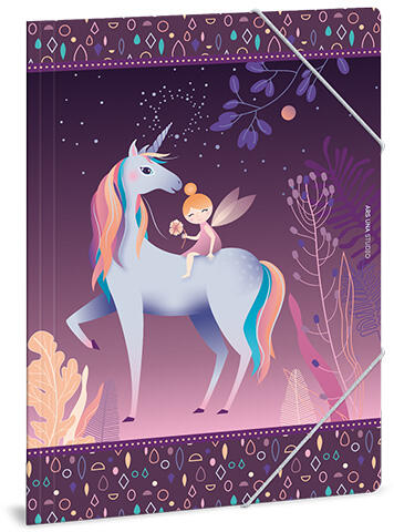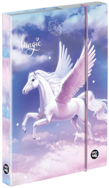 Pegazus füzetbox A/5, lila-rózsaszín. Méret: 16,8x23x3cm. Ideális füzetek, papírok, egyéb iratok tárolására. Gumis záródással.