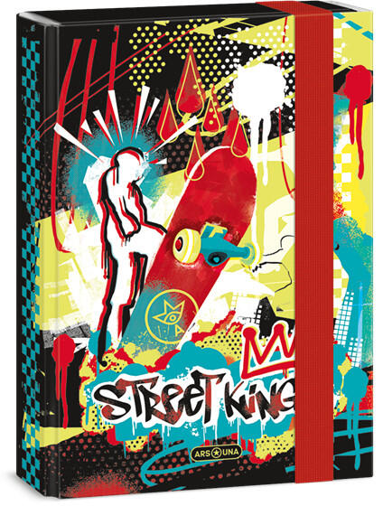 Ars Una Street Kings 24 (5357) A5 füzetbox A5 méretű füzetbox. Kemény, tartós kartonból, 4 cm-es gerinccel, fényes fóliával, 7 mm széles gumipánttal. Belseje egy színnel nyomott. Füzetek, iratok tárolására.