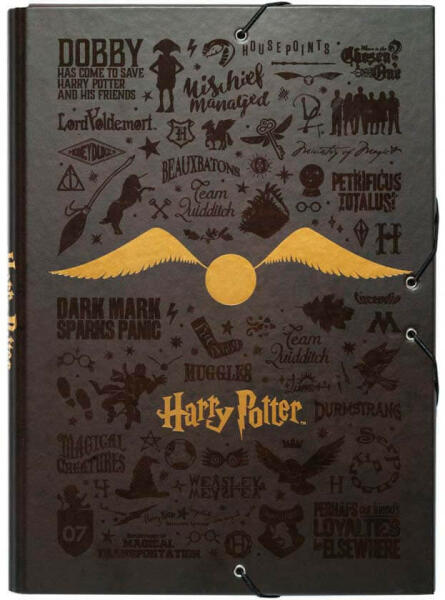 Gumis mappa A4 - Harry Potter Gumis mappa A4. Harry Potter rajongók számára készült ez az A4-es méretű gumis mappa . A strapabíró iskolai mappa 2 mm vastag kemény karton anyagból készült és mind a négy oldala zárt, így a beletett füzetek vagy papírlapok biztosan nem fognak kicsúszni belőle. A sötétbarna mappa elején a történetből jól ismert arany cikesz és a "Harry Pot